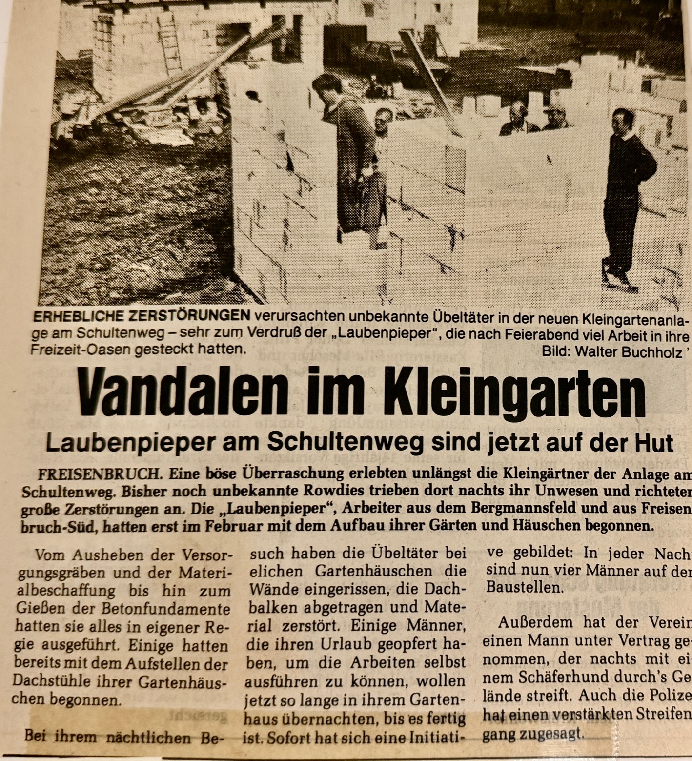 Bei uns in der Kleingartenanlage am Schultenweg kam es unlängst zu einer bösen Überraschung. Unbekannte Rowdys haben nachts massive Zerstörungen angerichtet – Wände eingerissen, Dachbalken abgetragen und Material vernichtet. Auch wir aus Bergmannsfeld und Freisenbruch-Süd hatten im Februar erst mit dem eigenenregiemäßigen Aufbau begonnen. Trotzdem sind wir entschlossen: Mit Nachtwachen, einem bewachten Schäferhund und Polizeistreifen schützen wir unsere Baustellen!